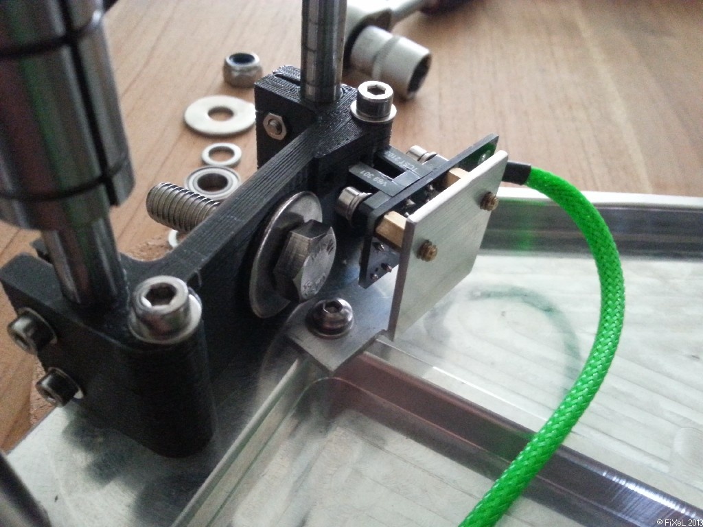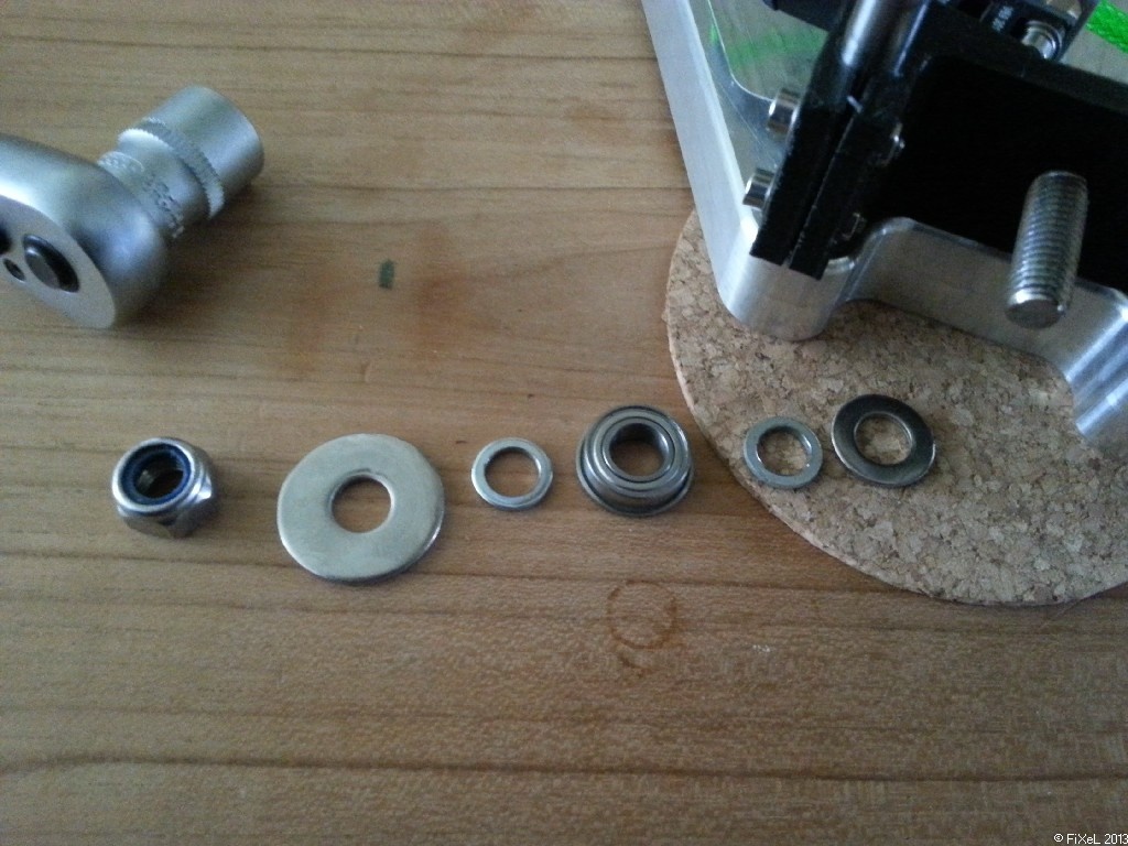 Er zitten nog wel een paar verzonken delen in het bevestigingsmateriaal, maar dit is bewust zo gekozen. Omdat ik aluminium poelies gebruik met een kleinere diameter, moet het lager wat als contra poelie gebruikt wordt ook kleiner zijn dan de standaard F608ZZ die doorgaans gebruikt worden. Het nadeel daarvan is dat je ze niet zomaar tussen 2 sluitringen van M8 kan steken, omdat de buitenring van het lager dan aan zou lopen op de sluitring.