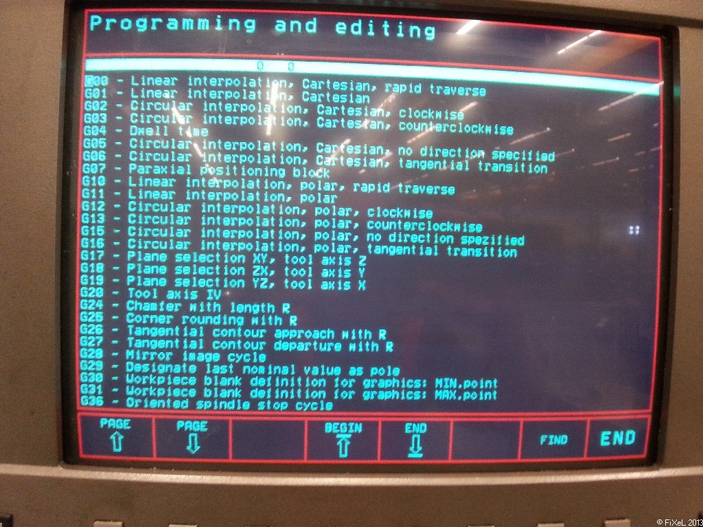 Een Heidenhain TNC410 CNC besturing die een deel van de beschikbare gcodes laat zien voor deze betreffende machine. (Verticaal bewerkingcentrum)