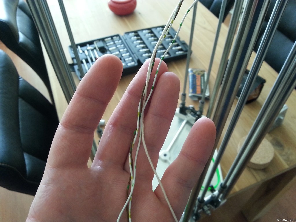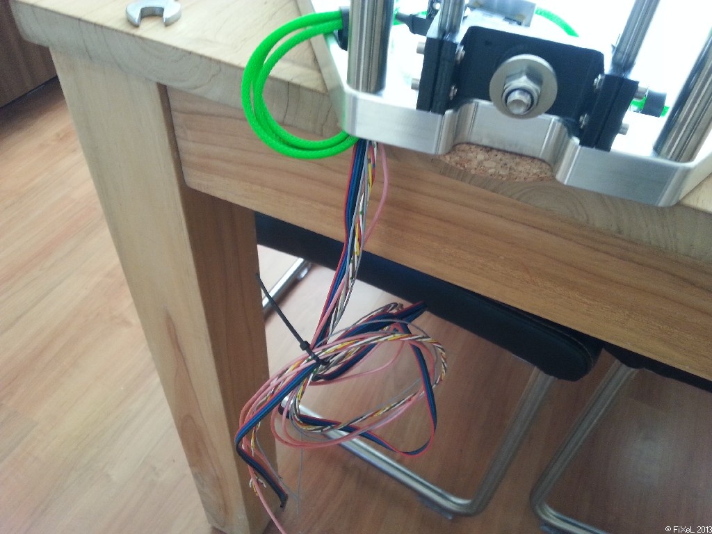 Drie draadjes, en een touwtje om precies te zijn. Ik wil in het platform waar de printkop in komt nog witte ledjes plaatsen, en die worden hier op aangesloten. De laatste draad laat ik zitten, als reserve mocht er ooit een draadbreuk voorkomen.