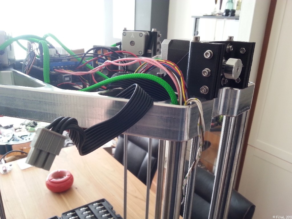 Bij het originele ontwerp wordt 12mm multiplex gebruikt voor de boven- en onderplaat, en 2 platen vertikaal om wat stevigheid te krijgen tegen het torderen van het frame. Nu is hout een prachtig materiaal om mee te werken, maar het kent ook nadelen, zoals kromtrekken. Bij het ontwerp wat ik gemaakt heb, maak ik gebruik van aluminium voor de boven- en onderplaat, drie RVS assen van 16mm om een stijf geheel te maken, en een RVS buis van 16mm die dient als kabeldoorvoer. De lineair assen lopen door geruimde gaten door de platen heen, zodat de plaatsnauwkeurigheid zo exact mogelijk is.