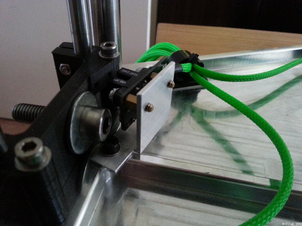 Het printje zelf zit op een aluminium hoekprofieltje gemonteerd met moederboard standoffs, en inplaats van de draden direct op de print te solderen, heb ik gekozen om er een stekker aan te maken voor het geval er toch eentje vervangen dient te worden. (nog niet getest) Tijdens het maken van het beugeltje liep ik tegen een probleem aan... De kop van de M8 inbusbout steekt zo ver uit dat je het boutje van M4 om het profieltje vast te zetten, niet kan plaatsen. Dus eerst de bout eruit, M4 erin, dan de bout van M8 erin... Wat een gekloot.